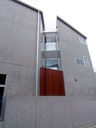 当初から道路との高低差のあるこの敷地形状では、擁壁の制作が重要なポイントであったが、RCうち放しの建物と擁壁は建築物として一体の外観。というこちら側のコンセプトがあったので外壁と同様のうち放しに見えるよう工夫をした。 |