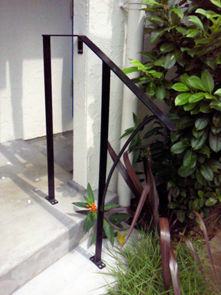 River Cafeのエントランス。門はロートアイアンでデザインしたものです。塀は枕木と異形鉄筋の組み合わせ、庭木ともマッチしています。 |